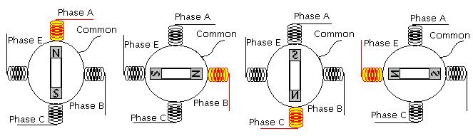 Now, using a common wire and the phase wire, you can rotate the stepping motor by supplying a source of voltage. As the power of each phase in sequence one after another, you can observe the stepper motor rotating in one direction.